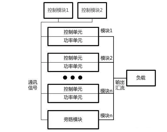 分布式是早期模塊化UPS經(jīng)常使用的一種架構(gòu)。此類模塊化UPS系統(tǒng)層面上等價(jià)于數(shù)臺(tái)獨(dú)立的UPS直接并聯(lián),其功率模塊利用小型UPS改造而成,可自主獨(dú)立工作,其特點(diǎn)是:①除整流、逆變的控制外,均流與邏輯切換也由內(nèi)部控制單元控制;②內(nèi)置容量與功率模塊容量一致的靜態(tài)旁路,在旁路模式時(shí),由每個(gè)模塊內(nèi)的靜態(tài)旁路共同承擔(dān)負(fù)載。