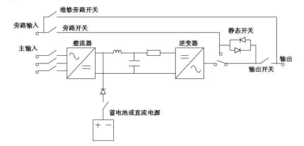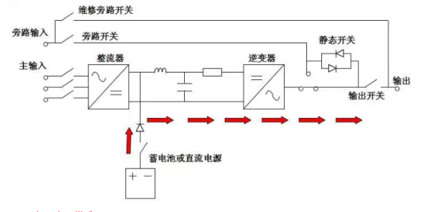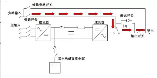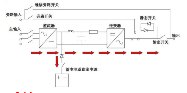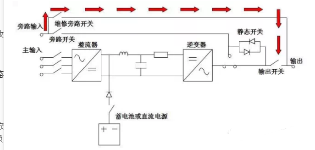 在正常交流電源供應(yīng)下,整流器將交流電轉(zhuǎn)換為直流電,將市電中的“電源污染”消除,并同時(shí)對(duì)蓄電池充電。再供給逆變器將直流電轉(zhuǎn)換為交流電,提供更穩(wěn)定的電源給負(fù)載。