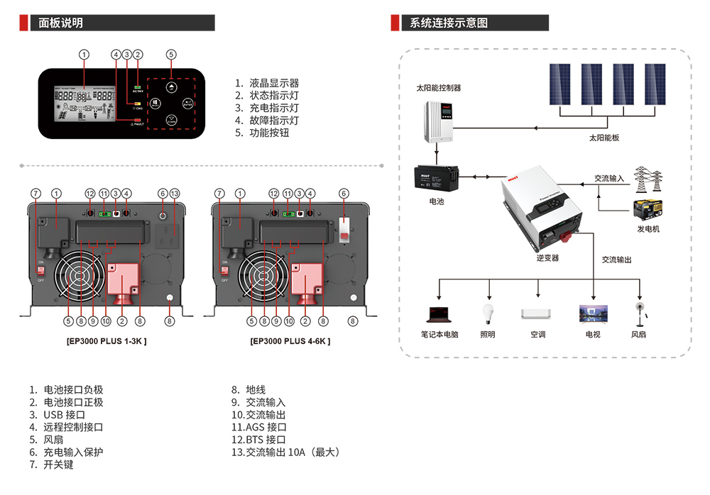EP3000 PLUS 系列是一款工頻正弦波逆變器,采用環(huán)形變壓器、大大降到了自身損耗,內(nèi)置 20A-60A 大功率市電充器、可在短時(shí)間將蓄電池充到 90%,廣泛應(yīng)用于家庭、通訊基站、ATM 機(jī)、車載、監(jiān)控系統(tǒng)、牧區(qū)、海島等戶用型光伏發(fā)電系統(tǒng)及 DC-AC 的供電系統(tǒng)。該系列產(chǎn)品采用壁掛式結(jié)構(gòu)、節(jié)省空間、安裝方便。
