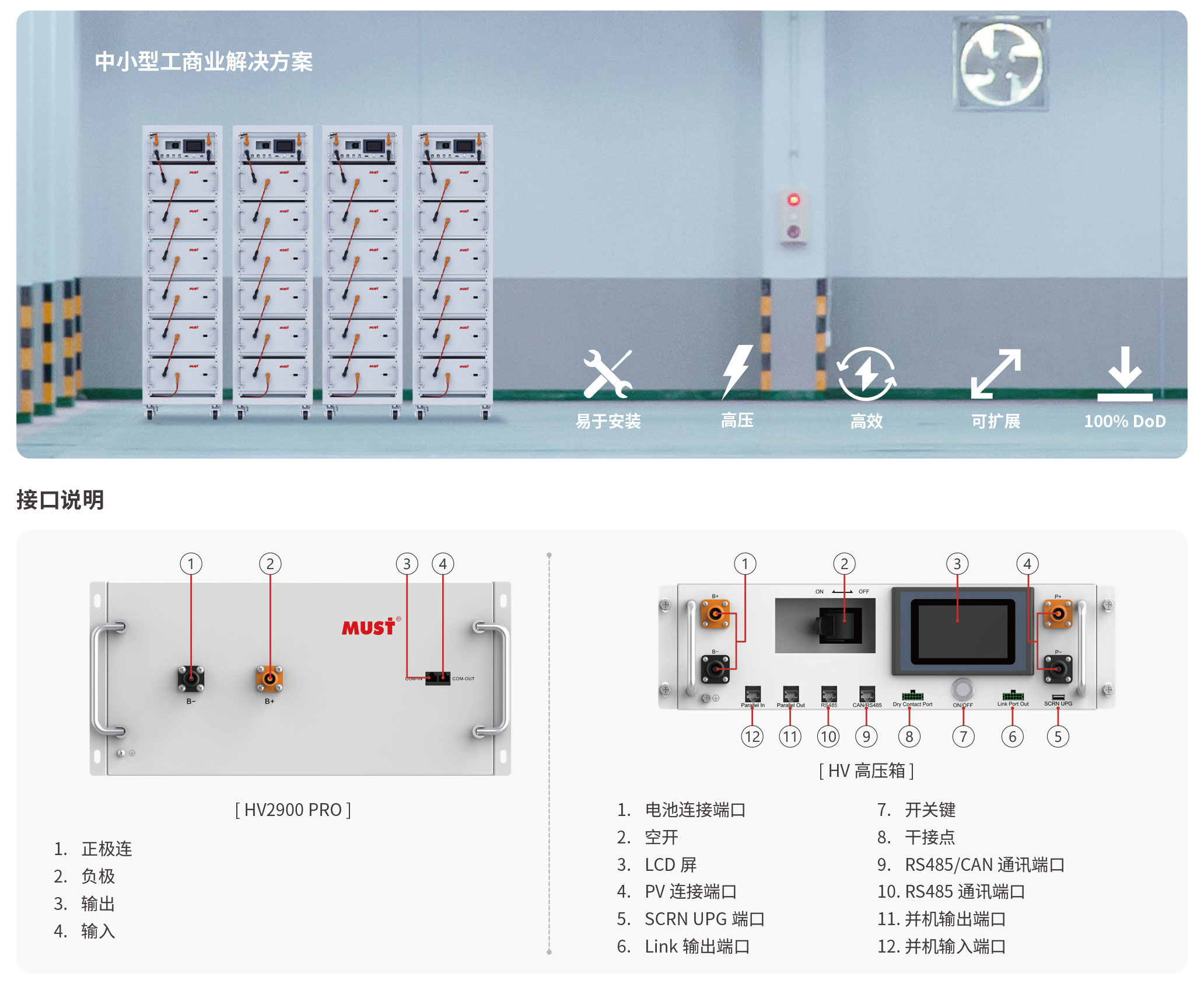 HV2900 PRO 是一款高性能、可擴容的高壓電池。高效靈活的模塊化設計,使其能適用于廣泛的儲能需求。支持模塊擴容,可以串聯(lián)安裝,最大擴充存儲容量為706.5kWh,安裝便捷,即插即用。