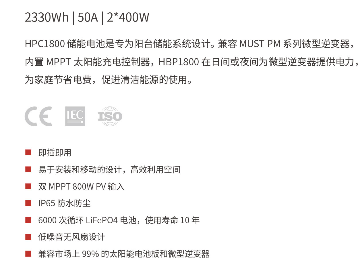 HPC1800 儲(chǔ)能電池是專為陽臺(tái)儲(chǔ)能系統(tǒng)設(shè)計(jì)。兼容 MUST PM 系列微型逆變器,內(nèi)置 MPPT 太陽能充電控制器,HBP1800 在日間或夜間為微型逆變器提供電力,為家庭節(jié)省電費(fèi),促進(jìn)清潔能源的使用。